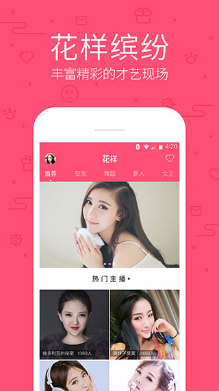 花样直播是一款给用户提供很多直播类型的软件,这里的直播都是非常清晰的,为你带来很多的直播介绍,让你在这里看到各种有趣的直播,帅哥美女非常的多,你可以进行直播的开播提醒设置,还能在这里看到很多的直播管理,有需要的用户可以下载花样直播看看啊!