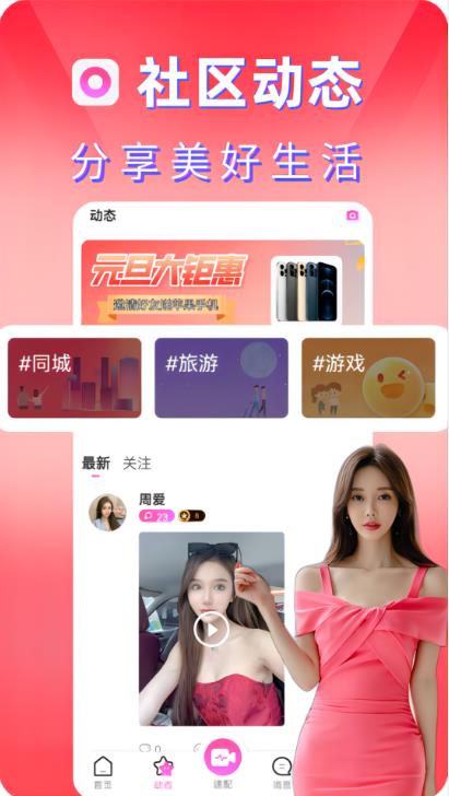 甜心小圈app,是一款非常有趣的社交软件。这里汇集了超多的单身用户,有来自五湖四海的,也有来自你的附近的,用户可以在这里轻松与陌生人互动聊天,享受到不一样的交友体验。软件还提供了丰富的互动玩法和聊天话题,让你们之间可以无障碍聊天,不再感到尴尬。感兴趣的伙伴快来下载吧。