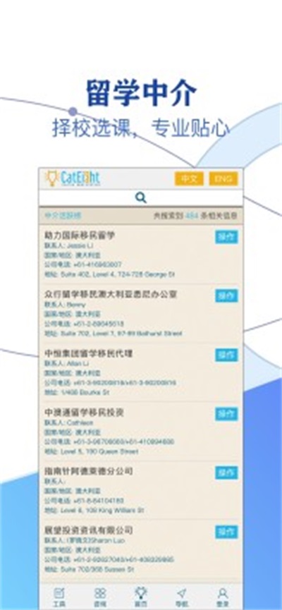 3、猫八网入驻了全球数千家教育/留学中介,提供专业贴心的课程选择和学生签证指导。