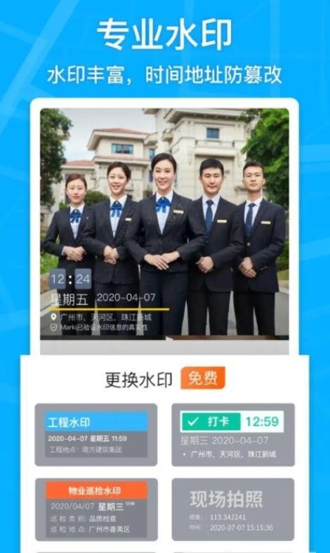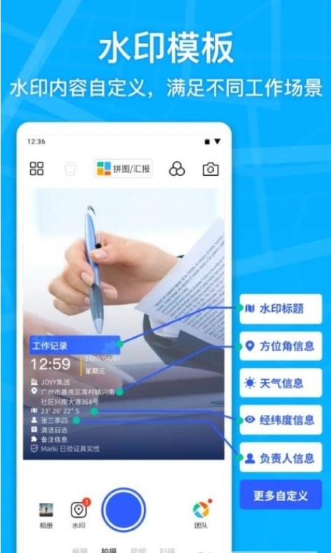 1、功能强大的拍照水印相机,能够自动添加水印打卡,更方便进行工作汇报。
