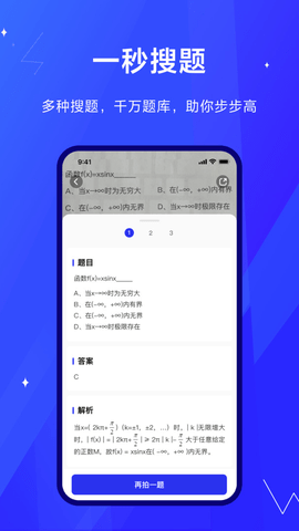 1、拍照搜题,摄像头对准问题,秒出答案,快速解题。