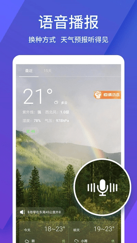 2、语音播报天气,地方方言播报天气情况,东北话、四川话、粤语等多种方言供您选择;