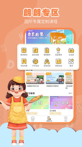 1、为了更好的服务幼儿园和老师,朗朗云课堂平台整合了课程体系、小熊系列动画、活动中心、家园圈、数据中心;