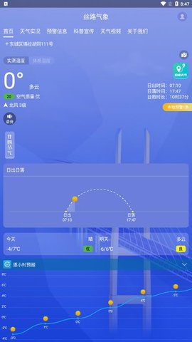 丝路气象app是一款非常全面的天气服务软件,主页功能齐全,实时温度、体感温度、空气质量、风力、日出日落时间、日照时长、小时预报、15天预报等,满足公众用户的气象信息需求,为决策用户和专业用户提供更详细的天气情况、分钟级降水等气象服务,同时还有语音播报功能,随时知道天气情况。