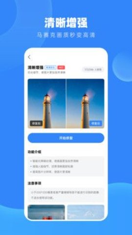 1、模糊修复功能:能够自动检测照片中的模糊问题,并进行修复,提高照片的清晰度。