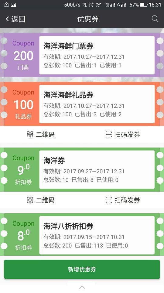 1、优惠券有着多种的新增方案,可以选择类型发放途径,也能选择使用的状态。