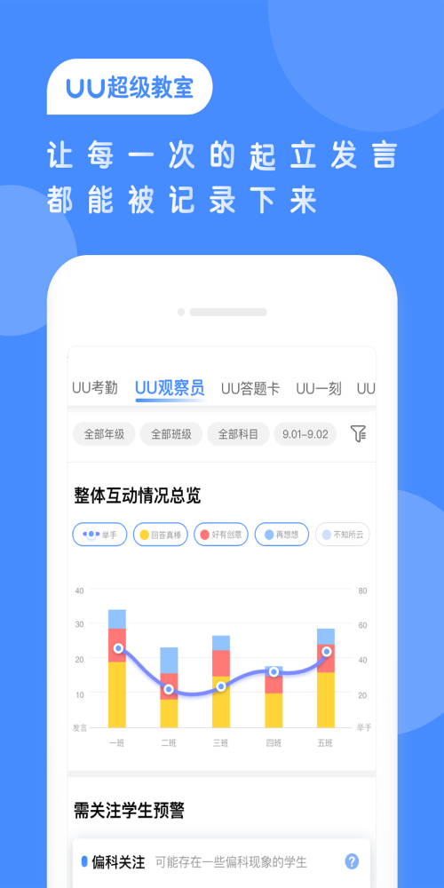 1、上课过程当中每一位学生的学习情况都会记录在这款软件当中,并用数据的方式进行呈现。