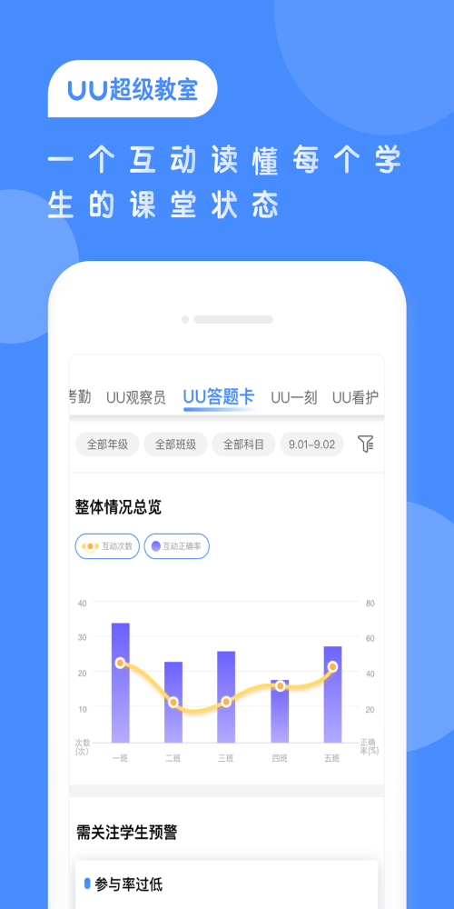 UU超级教室app是一款非常不错的智能教学软件,通过智能互动的方式可以简化教学,改变传统的教学方法,里面有不同的教学模式可以选择,并且数据收集的方式也非常的科学,可以通过数据的方式来展现学生的学习情况,专业化的教学模式给人们提供了很多的方便,管理起来是比较轻松的,非常专业可靠,有需求的来下载试试吧。
