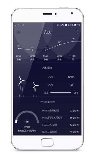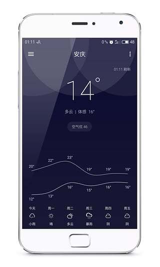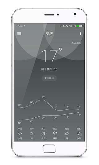 支持一周内气温趋势图、实况温度计动画显示以及风向风力盘图等。
