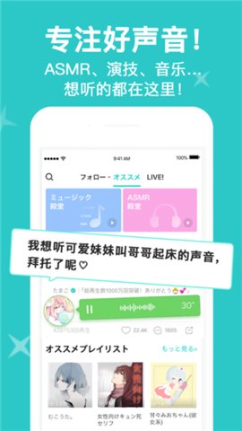 lispon官方版下载是一款线上声音社交互动平台,平台上聚集了很多配音演员,拥有丰富的声音和ASMR,用户可以免费在线收听,平台上有很多语音室,你可以参与各种话题的任意你的谈话,软件可以直接与成千上万的用户在线直播聊天,可以在任何场合使用,你可以和日本当红的配音演员带来声音盛宴。