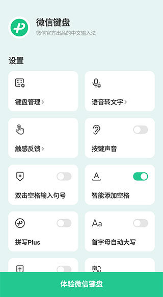 1、下载并打开微信输入法,按照教程启用之后来到下方界面,点击下方的体验微信键盘打开微信键盘输入界面。