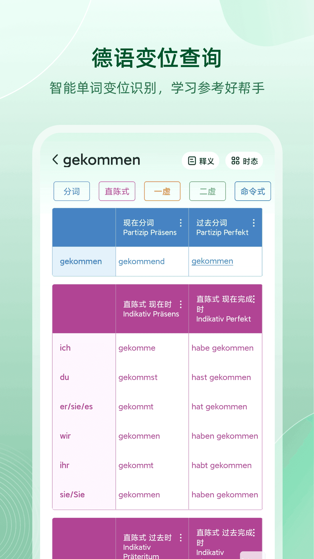 德语动词变位查询,提供17种时态的动词变位反查功能;