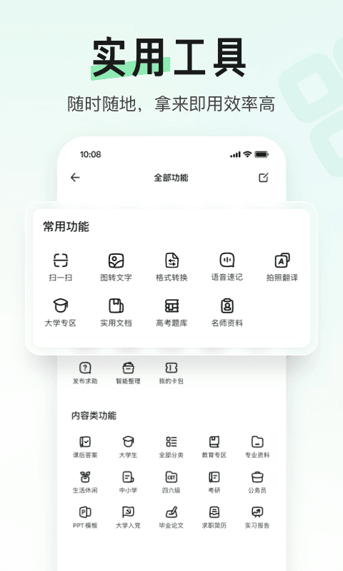 支持各种办公软件文档格式及格式转换。支持拍照搜题、拍照翻译、语音速记、图片转文字、文档导入等多种功能。