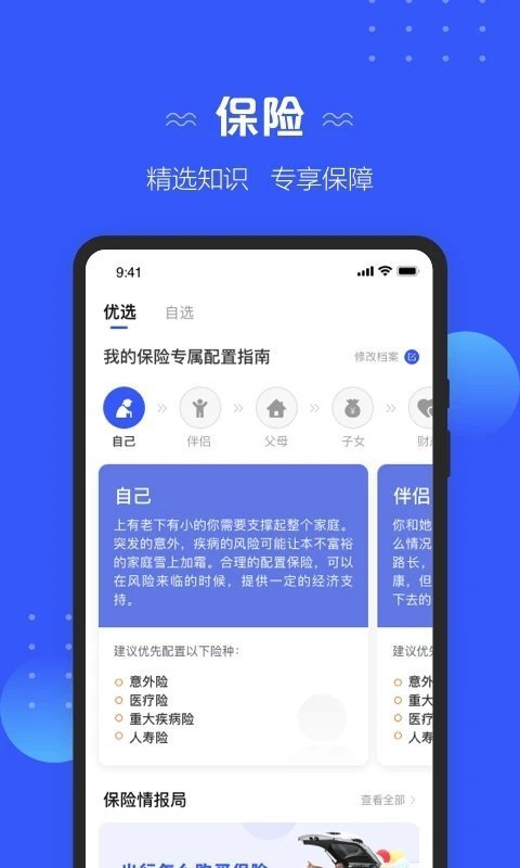 2.保险专区:为用户分析各类意外保险,汽车保险,财产保险,责任保险等保险。