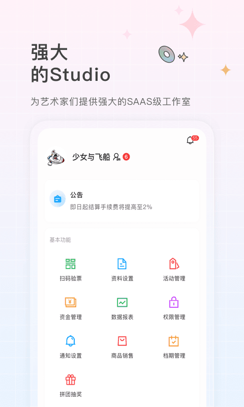 3.也提供了强大的权限管理、资金结算、数据报表呈现、推广营销功能,主办方可以实时的查看自己的票务数据,每一笔订单都将实时发到工作室的账户,并且可以增加自己工作室的团队成员来共同管理工作室,快速的结算渠道,让主办方可以在短短几分钟内收到票款,再也不必为现金流发慌。