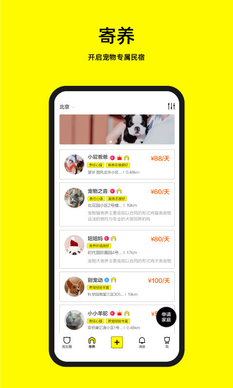 全国200多个城市,上万个超有爱的宠物寄养家庭。寄养家庭利用空余时间赚取利益,陪伴更多宠物。宠物主人临时出行,寄养方便,规划时间更自由。