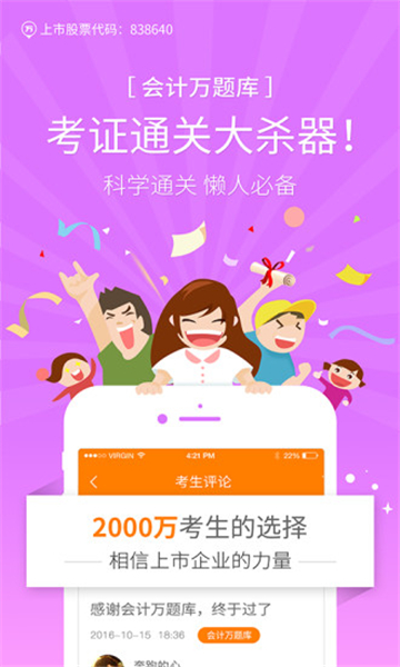 会计万题库是一款受欢迎的学习APP,提供免费的会计类题库、视频课程和全天免费直播。不论是自学还是学校学习,都能帮助考生快速通过会计考试。应用具有丰富的试题选择、智能出题和成绩预测等功能,同时提供精彩的视频解析,帮助学生更好地理解和掌握知识。适用于准备考会计的学生,并且得到了数十万用户的热评和推荐。