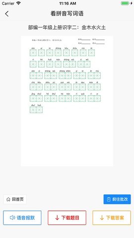 看拼音写词语是一款帮助用户学习汉语拼音的软件。提供了丰富的词汇练习,并通过拼音的形式展示每个汉字的读音和意思。用户可以通过听写、默写等方式进行练习,还可以选择不同的难度等级和模式,以满足不同层次的学习需求。此外,还提供了发音评测功能,帮助用户纠正发音错误,提高口语水平。