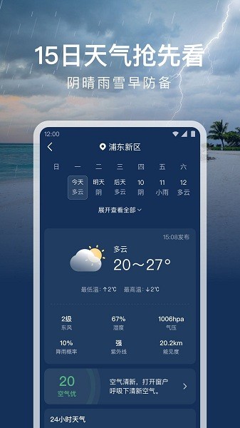 1.提供全面的空气质量预报,可显示15日趋势,提供PMPM10等空气污染物信息,帮助用户预防和应对雾霾天气。