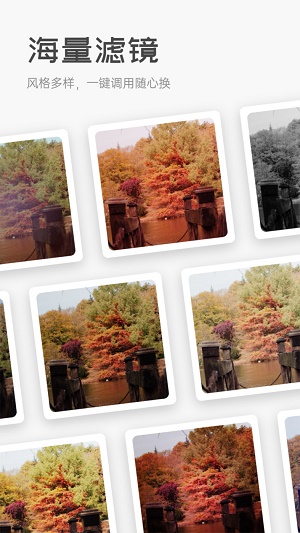 *全方位的照片制作功能,包括选择拼合的照片数量、调整尺寸比例、自定义照片素材和丰富的滤镜、特效、音效和音乐库。