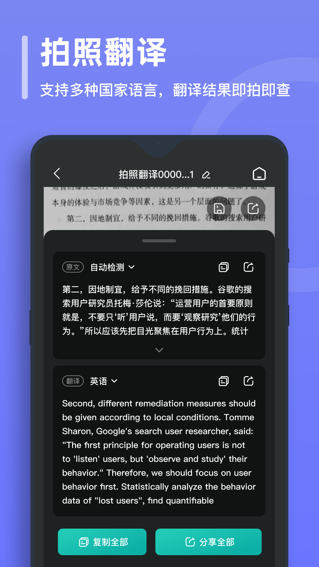 3、智能翻译:识别文本支持20多种语言的全文互译:中文、英语、日语、法语、德语等