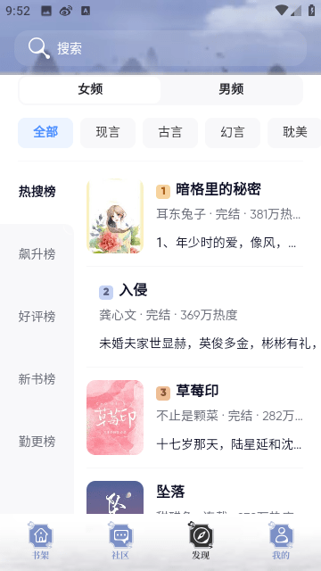 1、进入软件的时候就可以查看到非常热门的小说排名推荐。