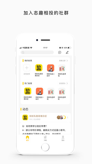 2、蚂蚁私塾提供志同道合的小伙伴社区,让用户可以找到和自己兴趣相同的人,以书会友,扩大阅读圈子。