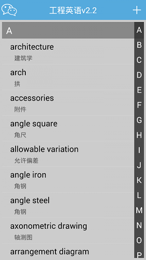 工程英语目前涉及了大量工程用语的英语学习软件,这块软件对于在工地上的用户是比较友好的,可以迅速了解到一些建筑器材的英文名称,有着详细的解读,对于建筑学的掌握可以提高一个层次,掌握更多有关于建筑方面的知识,提供的知识内容还是比较全面的。