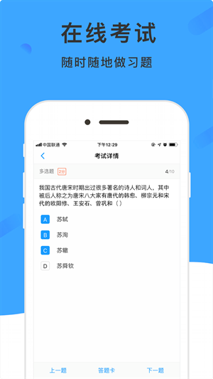 1.提供在线考试功能,在软件中进行自测和模拟考试,了解自己的学习情况。