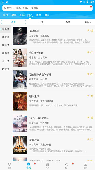 4、排行榜功能。软件提供了排行榜功能,用户可以直接查看每周、每月或一般排行榜,更方便快捷地选择自己喜欢的小说。