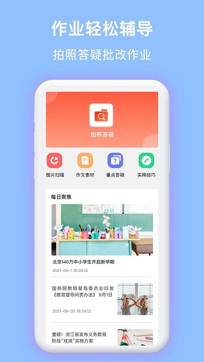 2.通过拍照搜题功能将作业题目拍照上传,提供详细解答和知识点解析,帮助用户快速解决难题。