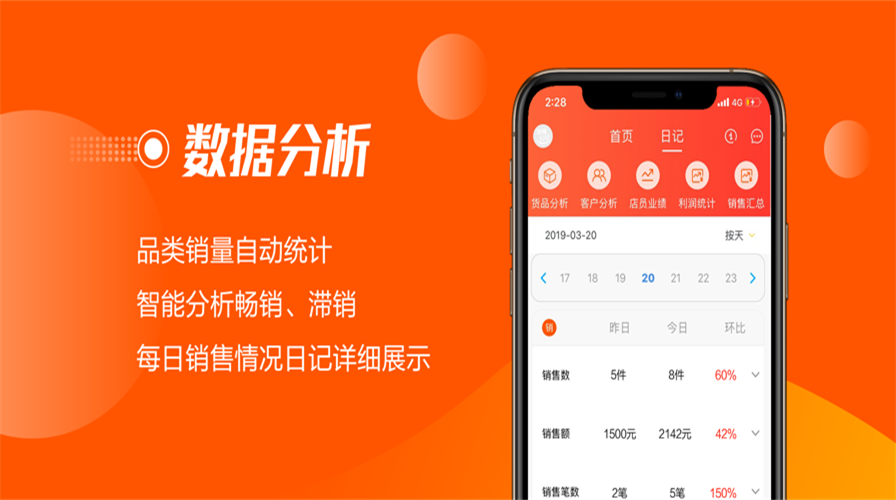 通过一部手机就可以操作,并且还有多家店铺管理的功能,不用再担心出门还得带电脑的问题,整体的使用感可以说非常的舒适的,除此之外它最大的亮点就可以自动生成统计图,让你更直观的了解数据,简直是一款办公的小能手。