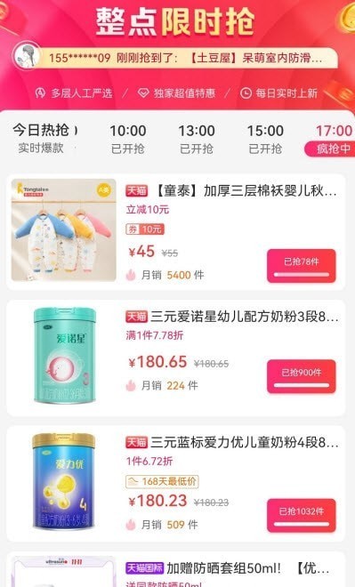 4.在特定时间段内抢购各种大额优惠的商品,享受到更大程度的优惠。