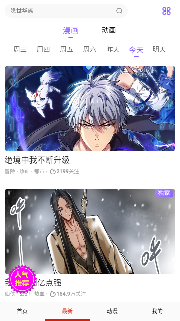 2、精品国漫日漫每日更新,涵盖日韩、少女、热血、悬疑、耽美、科幻、搞笑、校园。