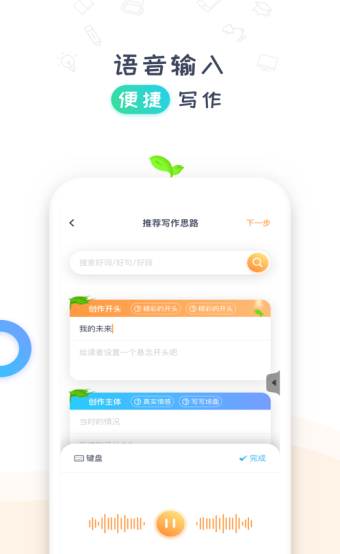1.引导式写作界面提供了写作顺序和指导,使用户更容易上手完成一篇完整的作文。
