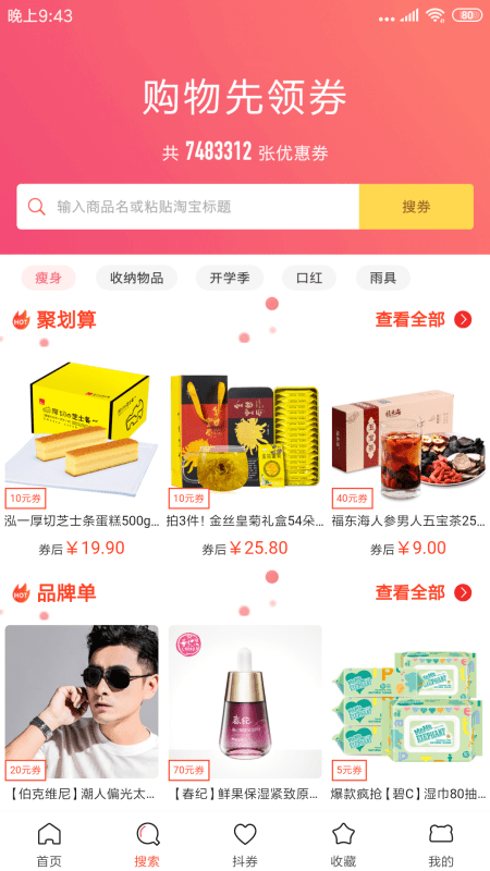 3、搜优惠券:与其他购物软件不同,可以先领券再购物,您可以先搜索您想要购买的商品,获取相应的折扣券,再进行购买,更加省钱。