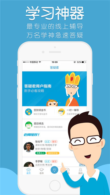 答疑君是一款手机在线答疑神器,提供无数学霸在线解答学习中的疑问,支持文字和一键拍照提问,预约一对一在线辅导,聊天功能让学习不再枯燥,还有错题本功能和丰富的学科难题解析。注册即送红包,每天签到领金币红包。知识面覆盖中学教材和历年中考/高考真题,让你成为学霸。答疑君是学生们的学习解答神器,帮助他们提高学习成绩,解决各种学科难题。