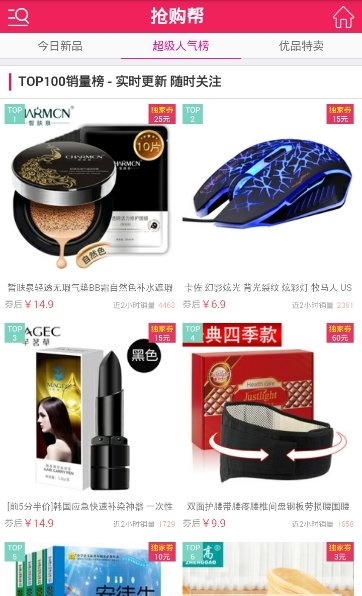抢购帮是一款手机购物软件,商品种类齐全,采用CPS自营品牌直供,每日千款更新,优惠券折扣直播活动,限时限量特卖,全场1折包邮,用户可以轻松抢购超值商品。提供准确的推荐匹配,售后服务支持七天无理由退货。真正允许用户购买高质量和低价格的专业配件,省钱不止一言不发。是一站式导购,专注超值抢购。