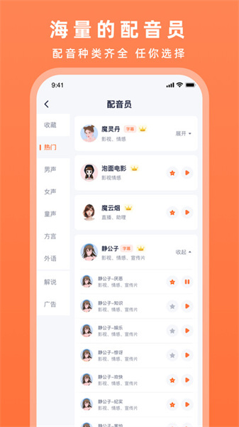 2.拥有超多的专业配音员,可以选择合适的配音员为作品完成配音,提高作品的质量和表现力。