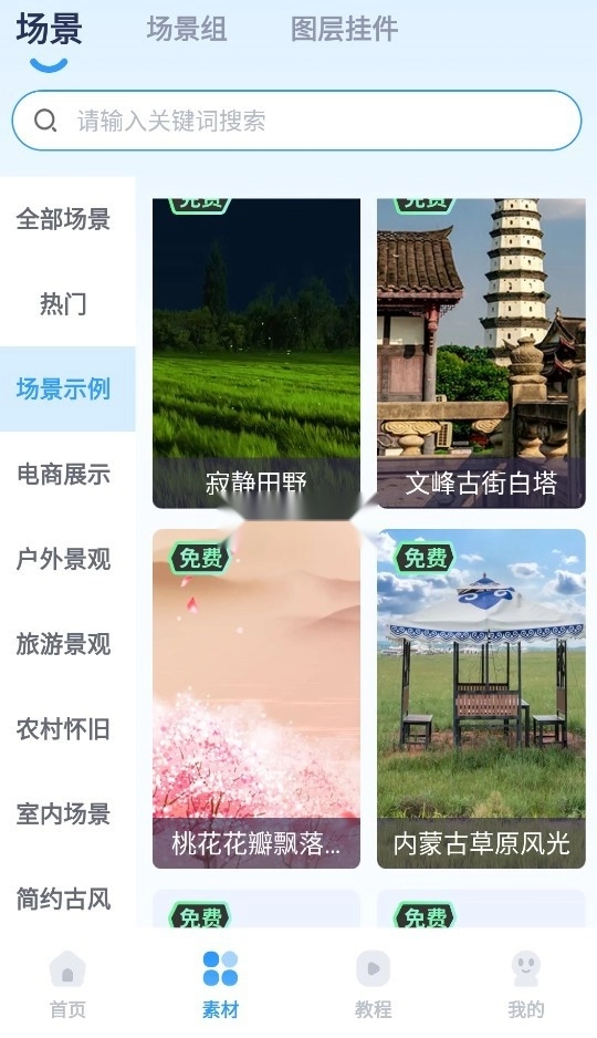 本app的场景非常丰富,包含电商展示、户外景观、旅游景观、农村怀旧、室内场景、简约古风、自然美景、娱乐舞台、炫酷科技、创意合成。