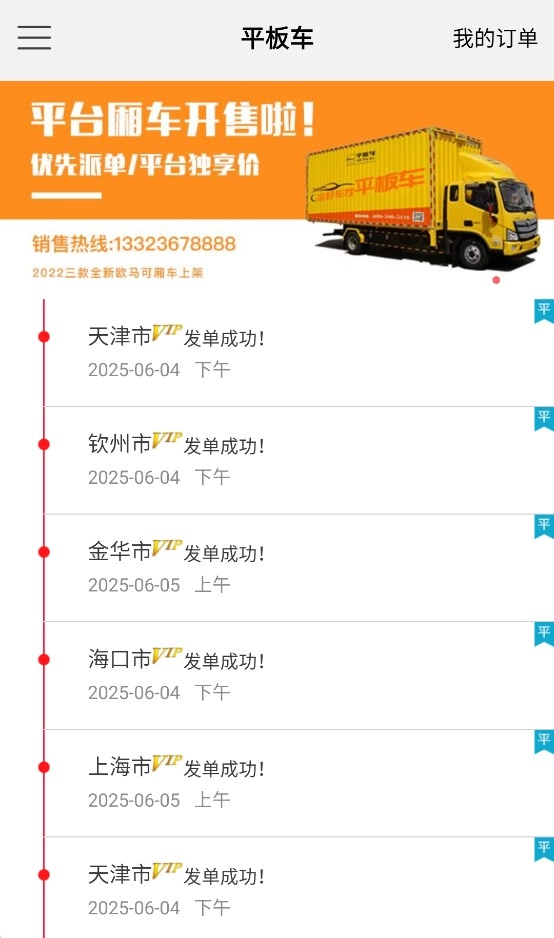 2. 点击进入平台车页面,就能查看不同城市的下单成功记录,这些记录涵盖时间与发车地,便于用户实时了解订单动态。