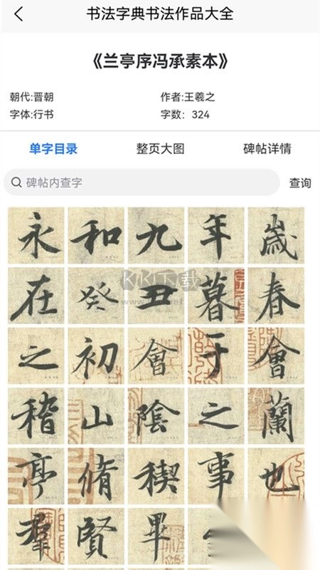 1、碑帖单字,把经典书法碑帖截成单字图片,配上米字格,每页展示一张,更方便、更准确的在手机端读帖、临帖