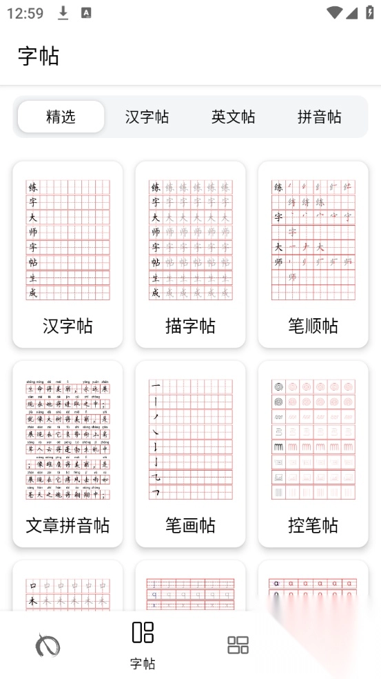 2、支持多种练字纸,包括方格帖、田格帖、米格帖、拼音田格帖、米格帖,还有各类英文帖。