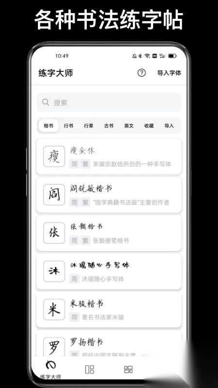 练字大师APP免费版,是一款专门为书法练习打造的软件。在这款软件里,只需输入文字,就能生成各式各样的字体,方便用户进行临帖练习。其涵盖的字体内容十分全面,像楷书、行书、草书等经典历史字体都一应俱全。并且,每种历史字体下又包含众多名家字体,就拿楷书来说,热门的荆霄鹏、田英章、庞中华等名家字体都能找到。每一种字体给人的临摹体验都大不相同。
