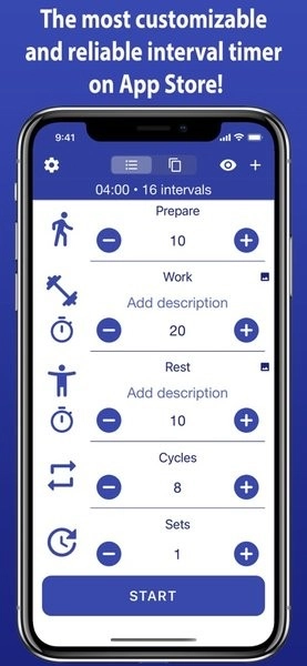 非常直观的界面。安装此计时器后,您需要按一个按钮即可开始具有经典设置的 Tabata 锻炼。