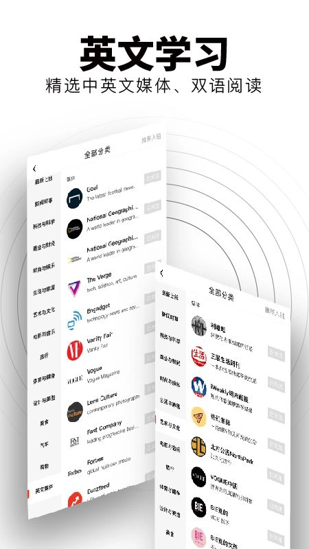 3、英文学习专区整合了多家中英文媒体资源,提供双语阅读功能,既有助于语言练习,又能拓宽视野。