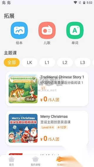 4、点击拓展,这里有一些课外活动,如绘本、儿歌等。