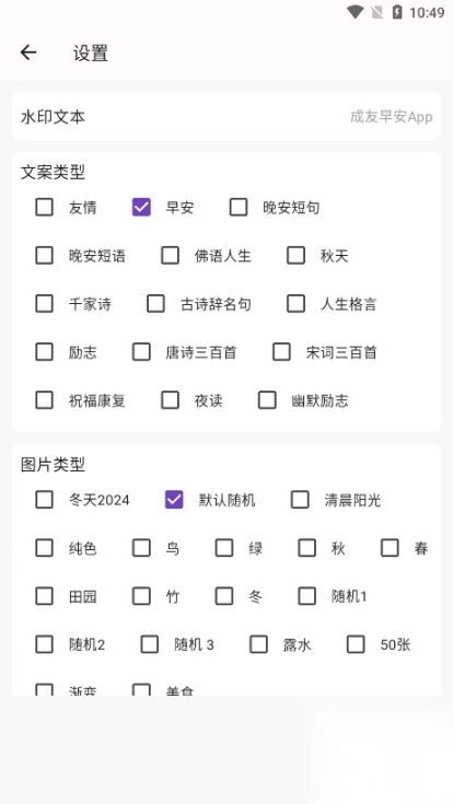3. 在设置中能够对图片、主题、文案主题以及水印签名进行更换。
