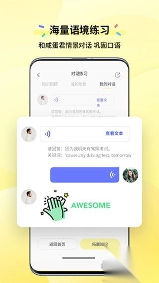 咸蛋口语APP,一款专为中国人打造的口语学习软件。它依据国人学习习惯与教育体系,精心设计英语口语学习内容。在这里,你能自由挑选心仪的口音,无论是美音还是其他,还能进行针对性极强的口语练习。 对于雅思、托福、托业、商务英语、四六级等各类涉及口试的考试,咸蛋口语都准备了相应的课程开展专项训练。软件运用国际领先的AI发音识别技术,精准判断你的发音与口音是否正确、流畅。同时,每日设置情景对话练习,帮助用户充分锻炼,做到面对考试或实际交流时从容不迫。有需要的朋友,赶紧下载体验吧!