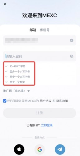 在输入邮箱地址与密码后,点击【注册】。需注意,密码需至少10个字符,同时要涵盖大写字母、小写字母、数字以及符号。